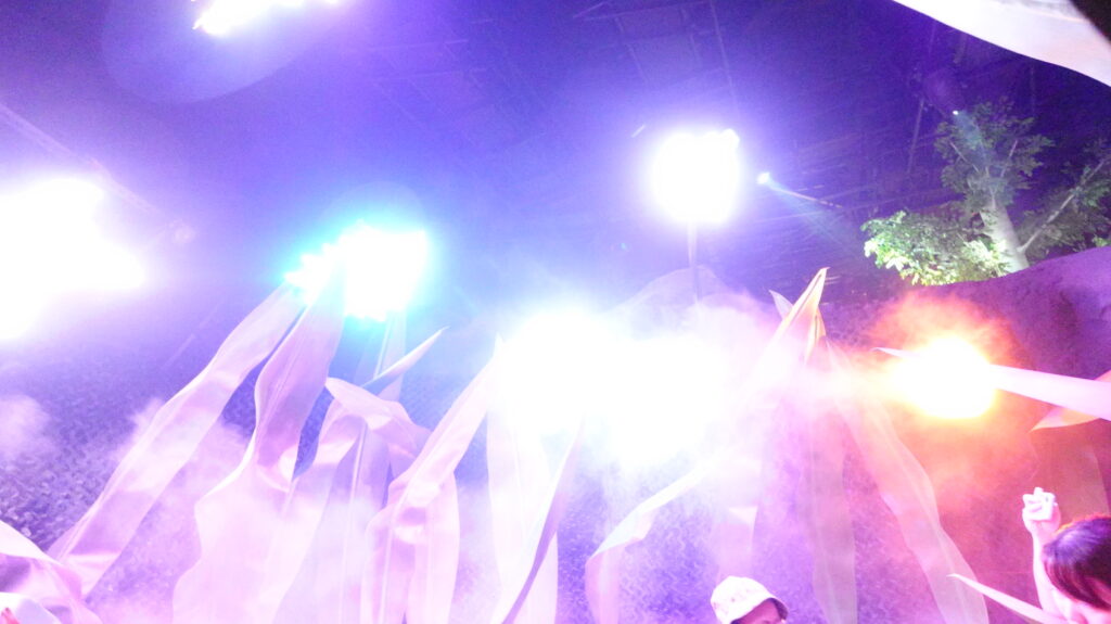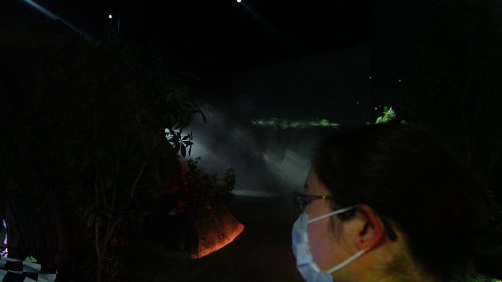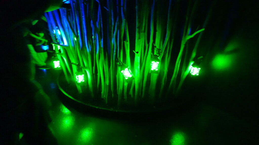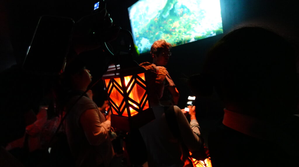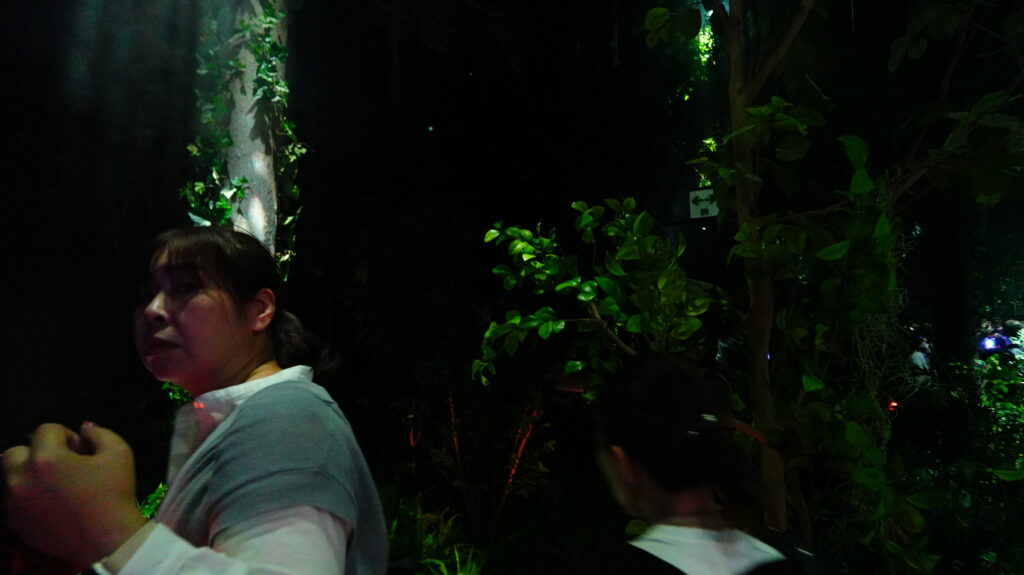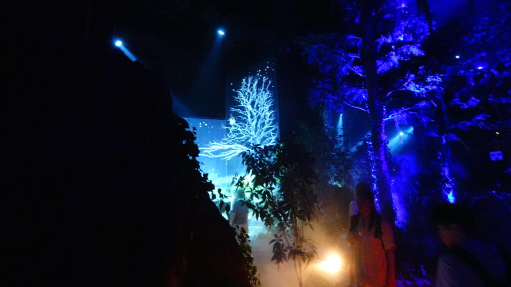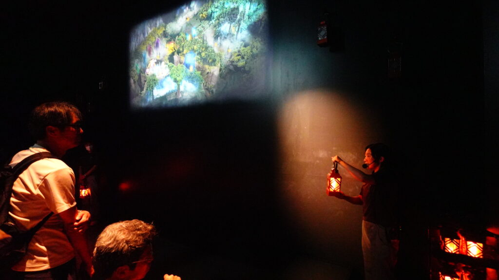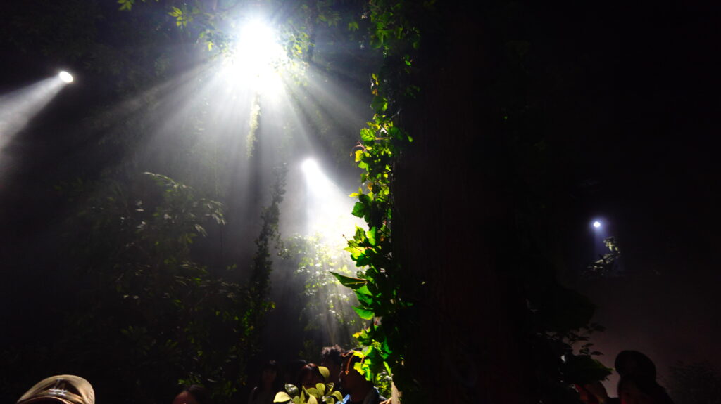 「皆さんが集めた命の物語のおかげでたくさんの記憶が蘇ってきました」というマザー・ツリーの声とともに、体験はパフォーミングシアターへと進みます [36:24]。
