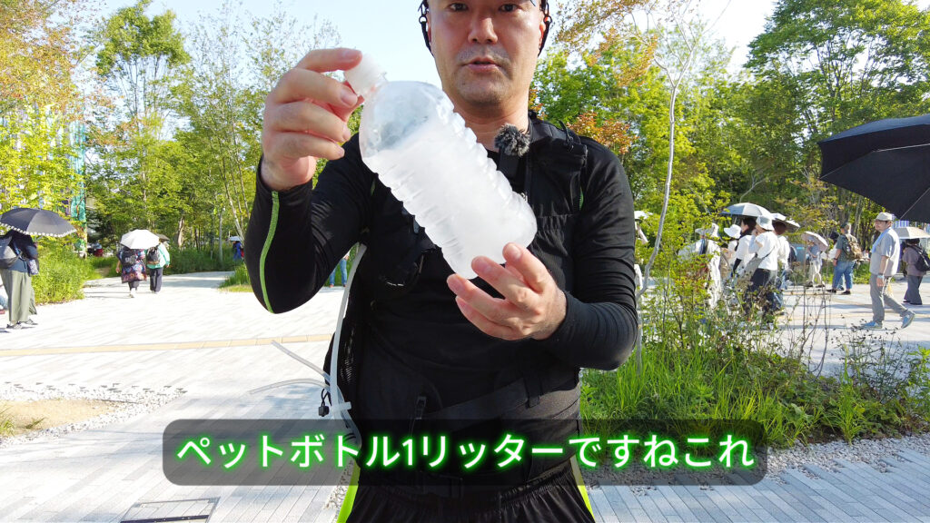 - 新しいボトルの装着: 今回は1Lペットボトルを使用(2Lは背中のファスナーから装着)。ペットボトルの口に合わせた設計のため、市販のボトルで即座に対応できるのが強みです。[49:03]