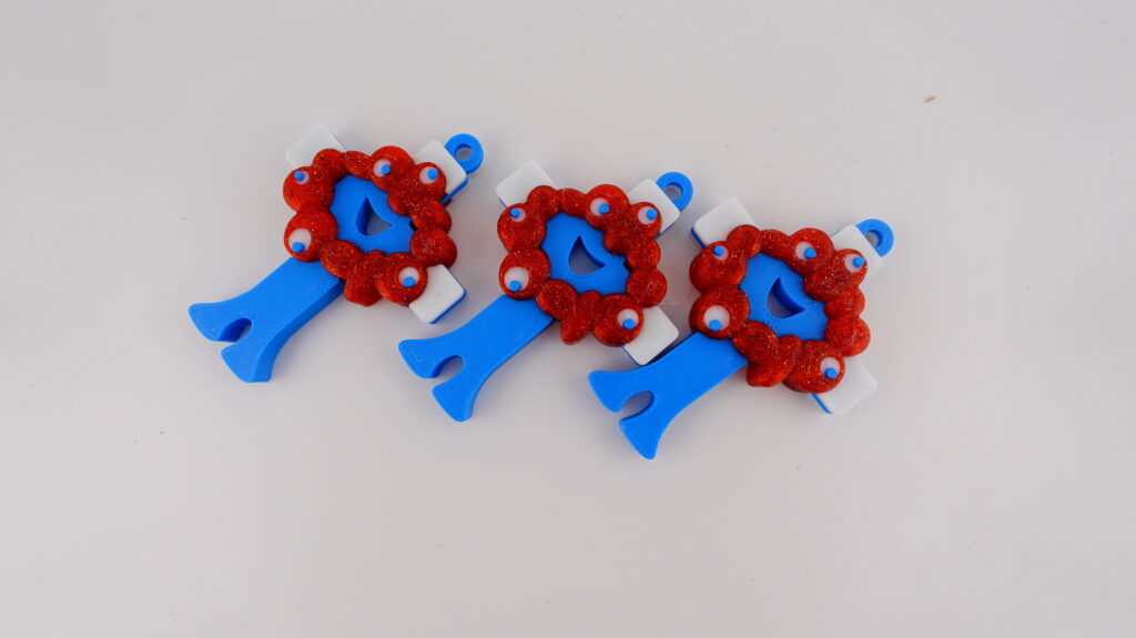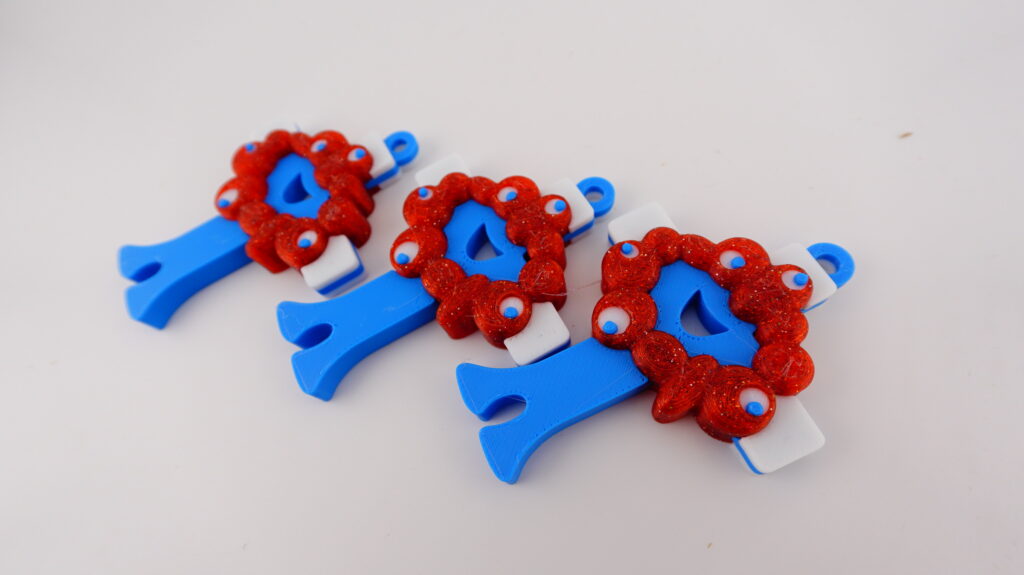 - 鮮やかなカラーリング:ミャクミャクの象徴的な赤と青を、バッグや鍵につけても目を引く鮮やかな色味で表現しました。