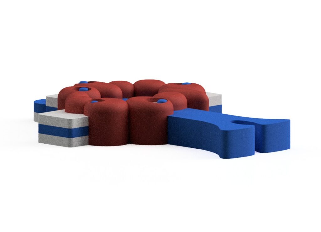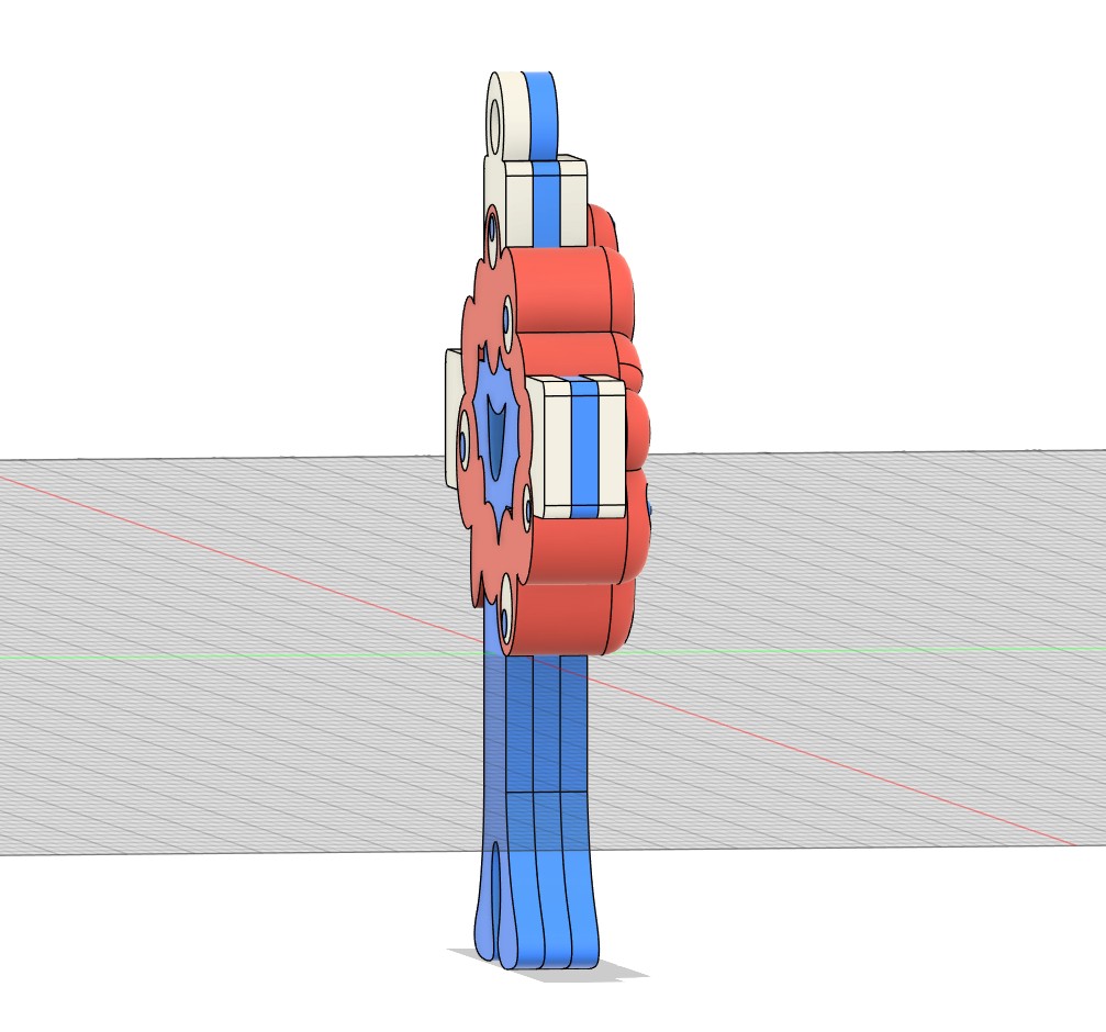 ミャクミャクのアイコニックな青い体と、増殖する赤い細胞をモチーフにした、まるで小さなミャクミャクそのものが手のひらに乗ったようなデザイン。