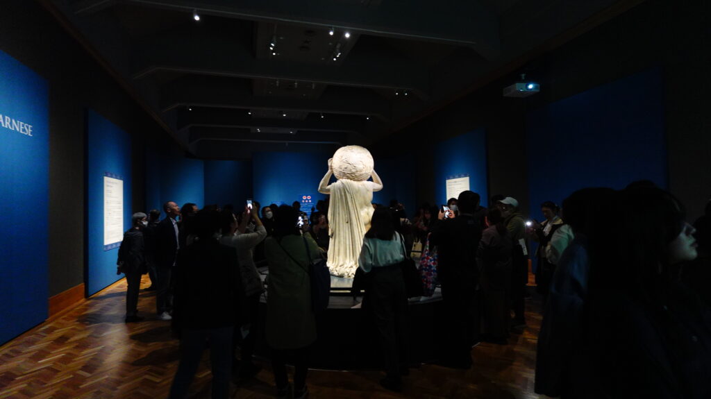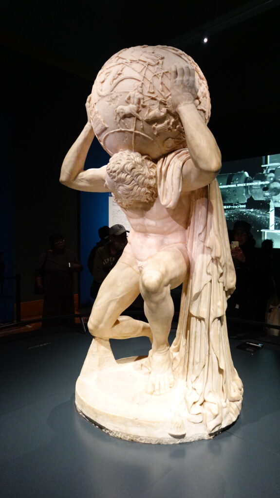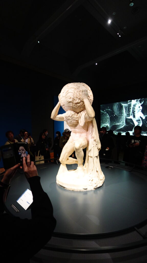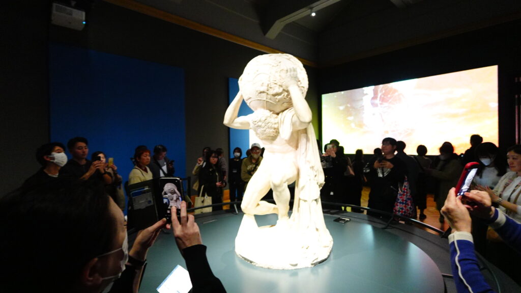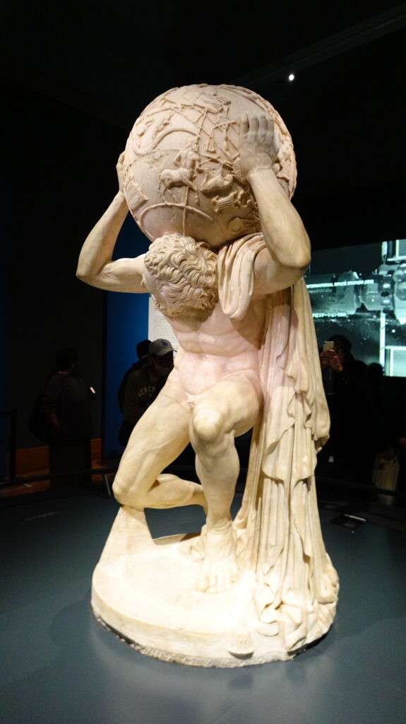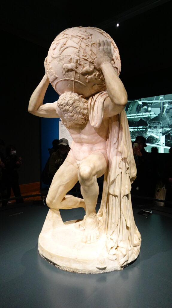 この作品は西暦2世紀のローマ時代に大理石で模刻されたもので、高さ193cm、直径102cmの巨大な天球儀を背負うアトラス像です。ナポリ国立考古学博物館が所蔵しており、古代ギリシャの宇宙観を精緻に表現した星座や黄道十二星のレリーフが天球儀に彫り込まれているのが特徴です。この彫刻は古代彫刻の最高傑作ともされ、2025大阪・関西万博で初めてアジアに公開されました。展覧会会場ではこの圧倒的な存在感の石造彫刻がメイン展示として紹介されています。