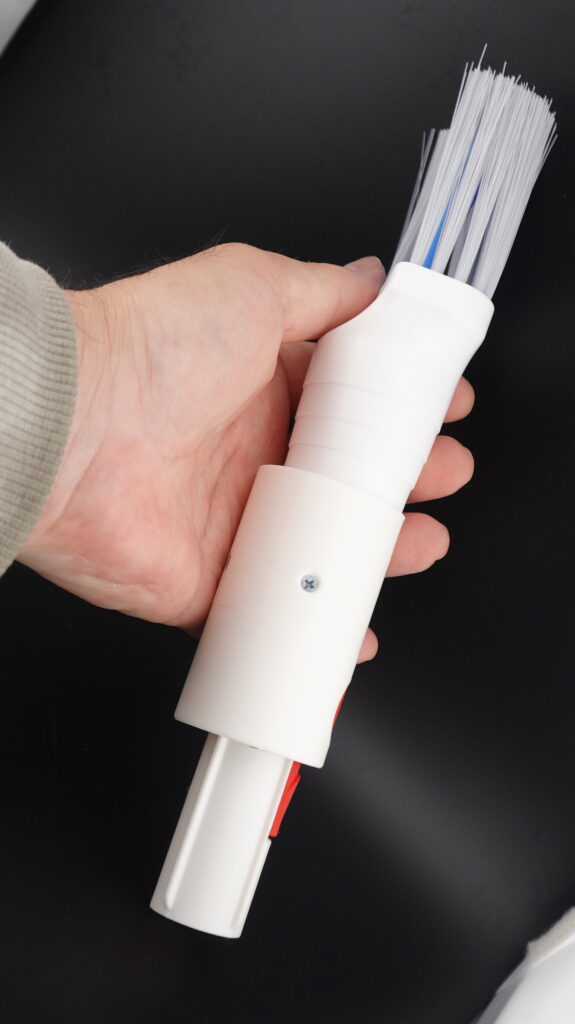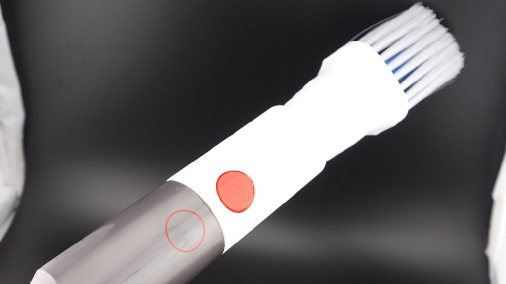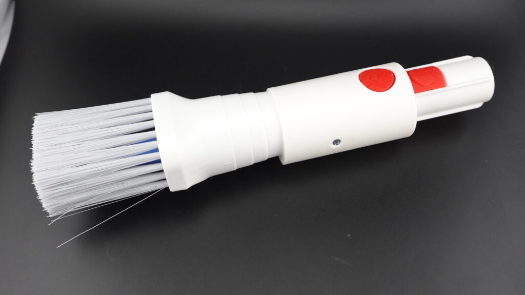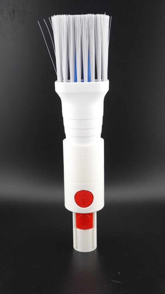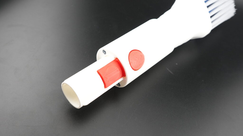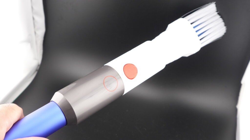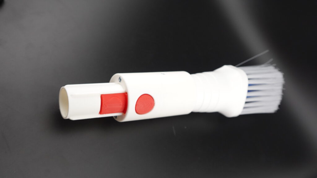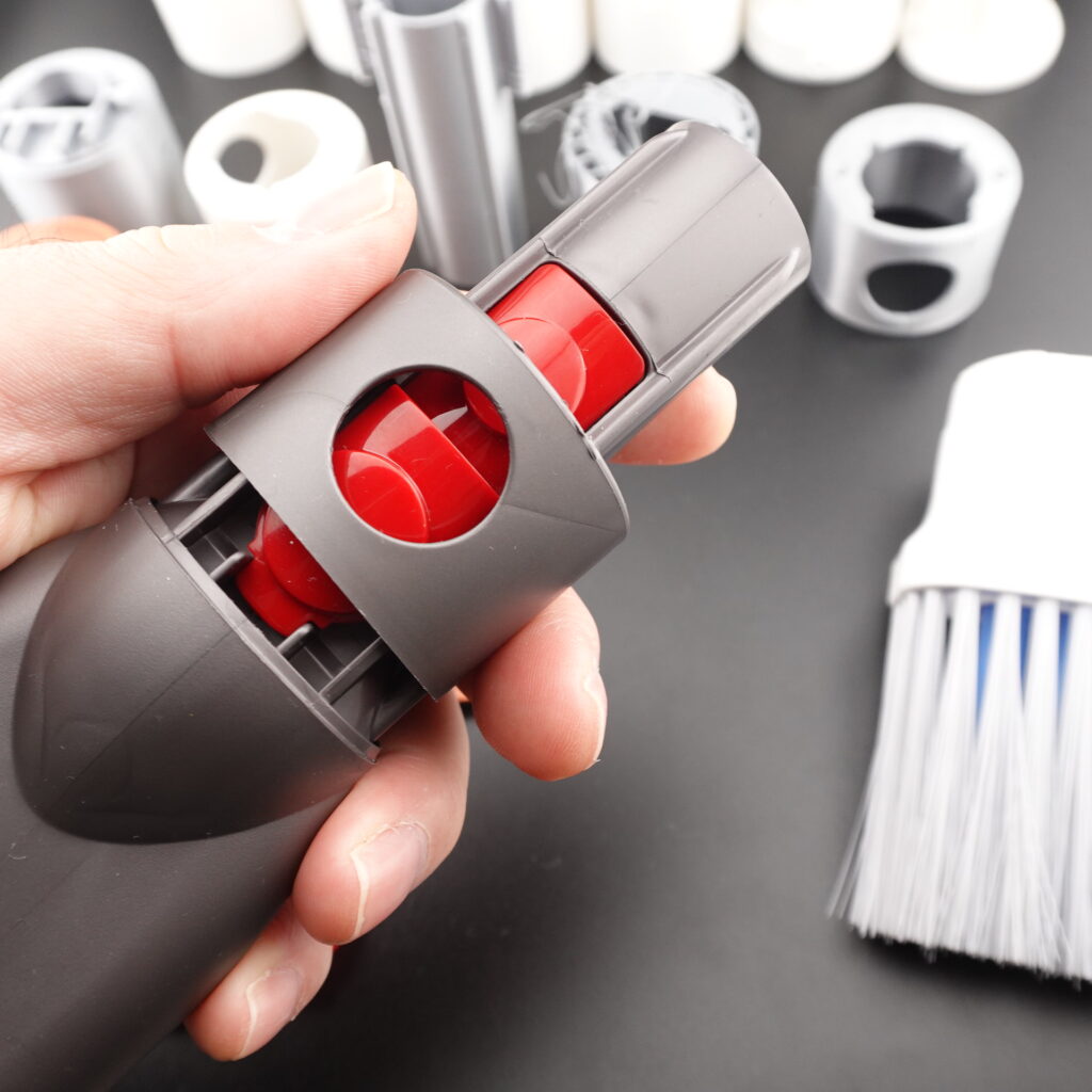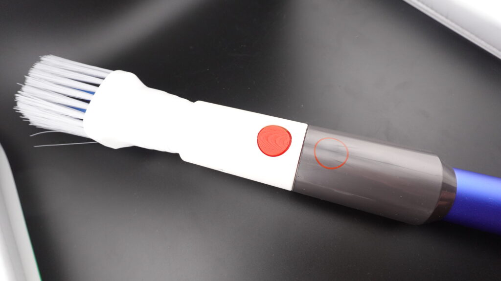 100均で買ってきた、掃除機用スミ・隙間掃き出しノズルを合体させて、ダイソンのコネクタと同じギミックに仕上げました。