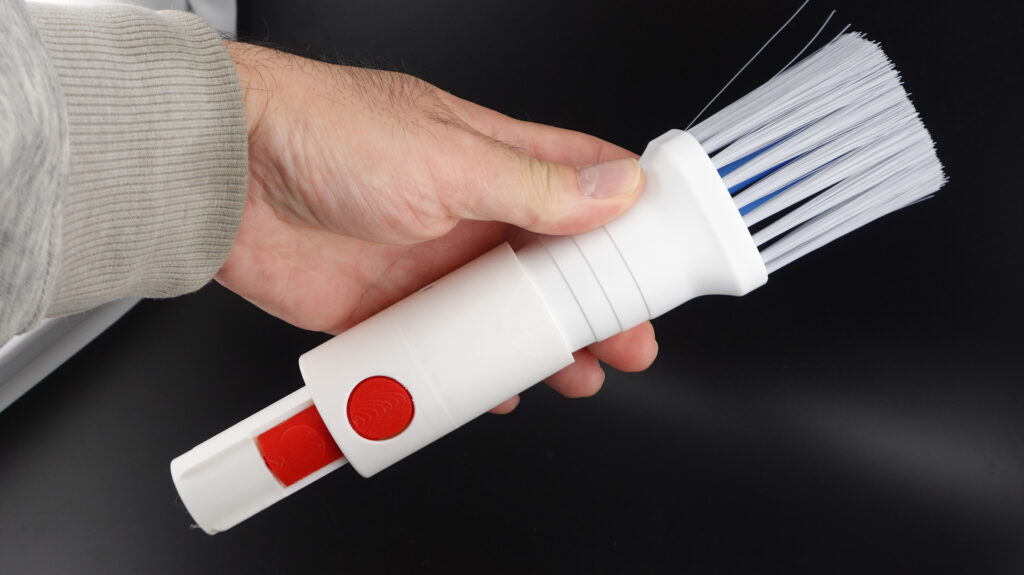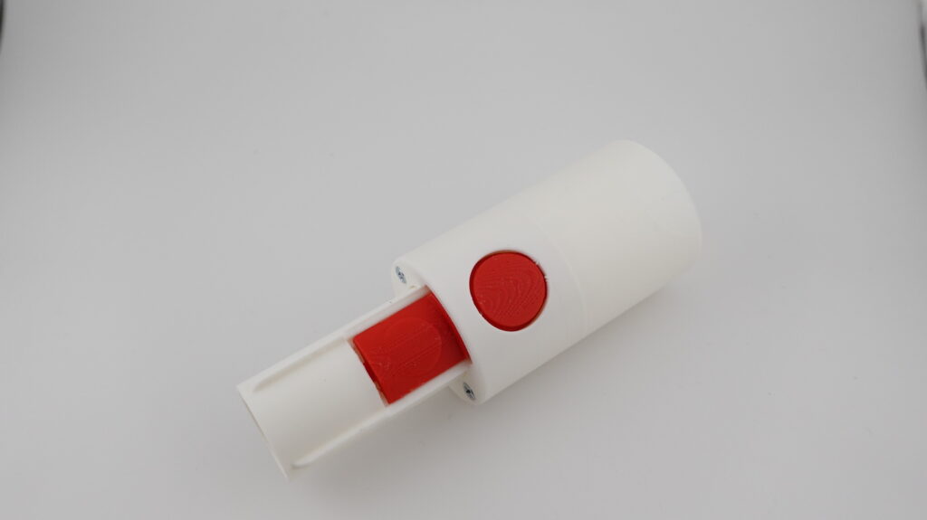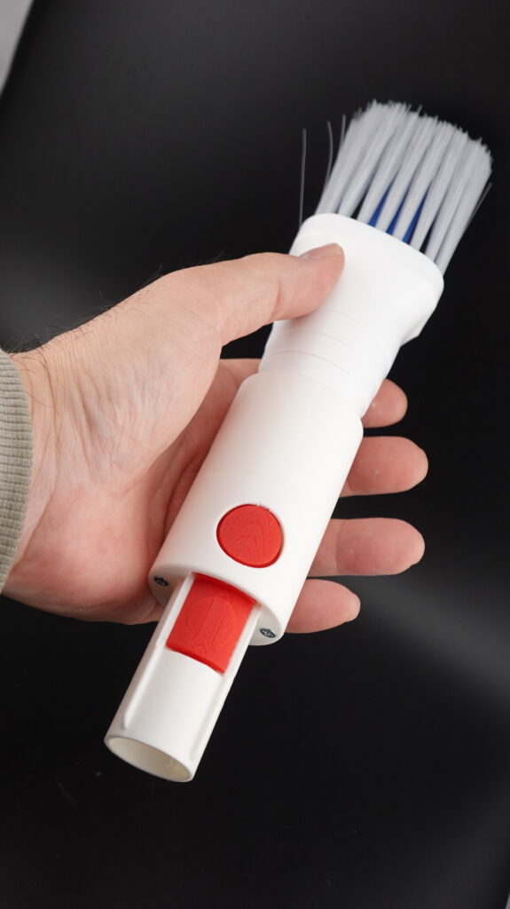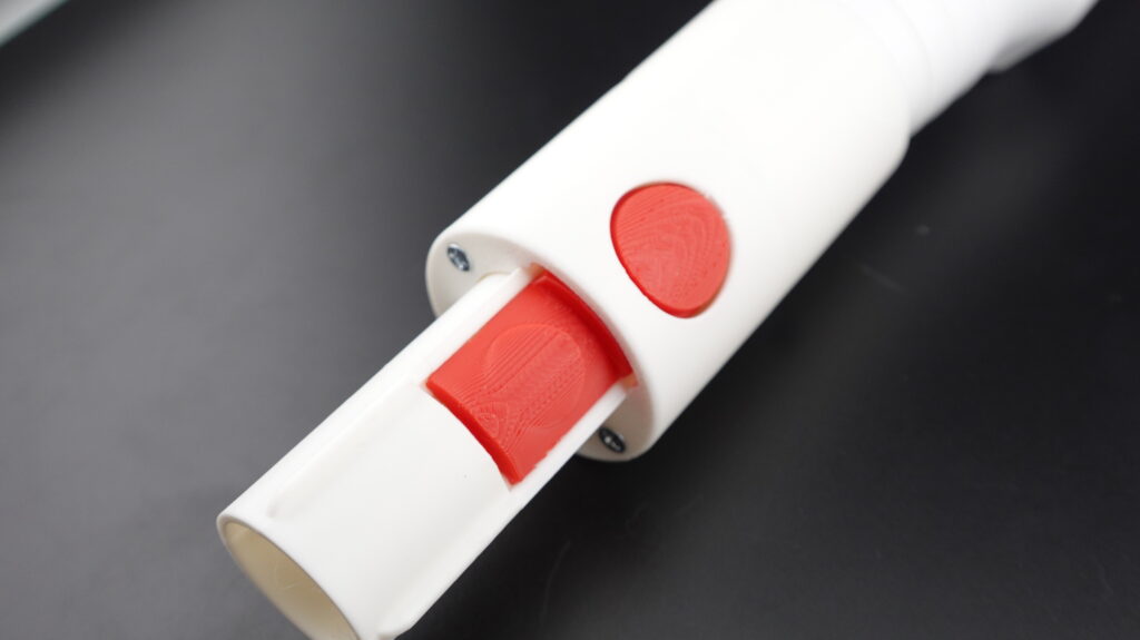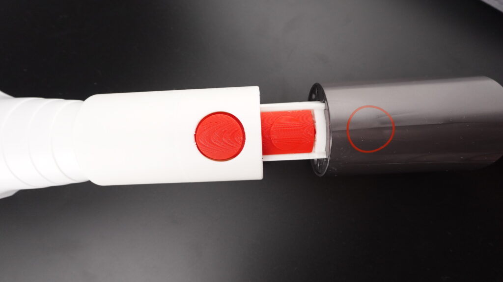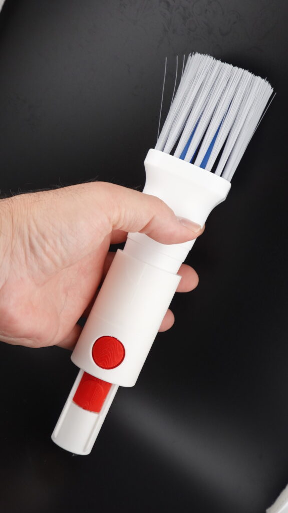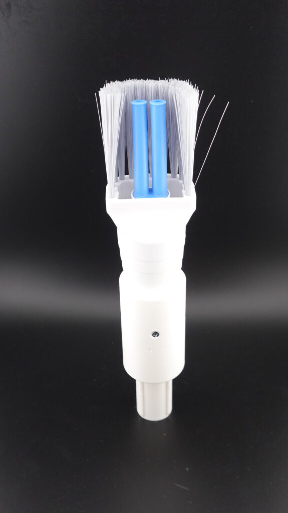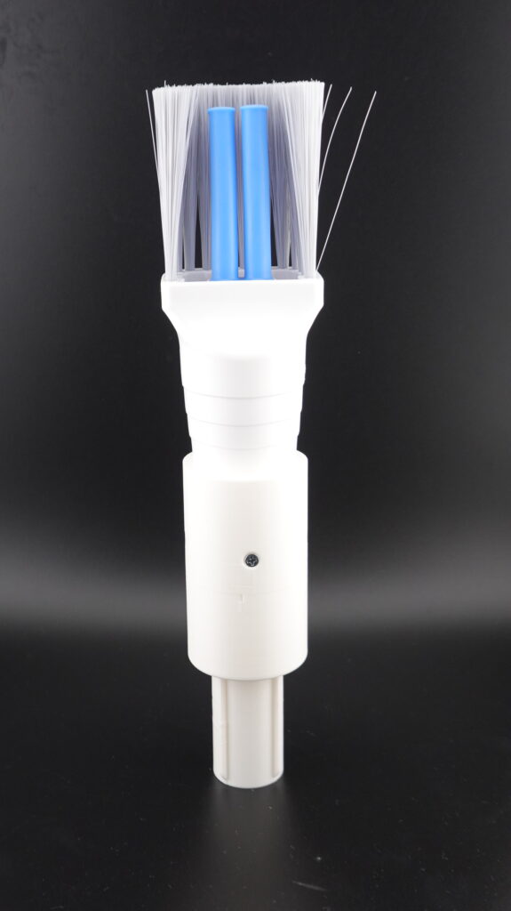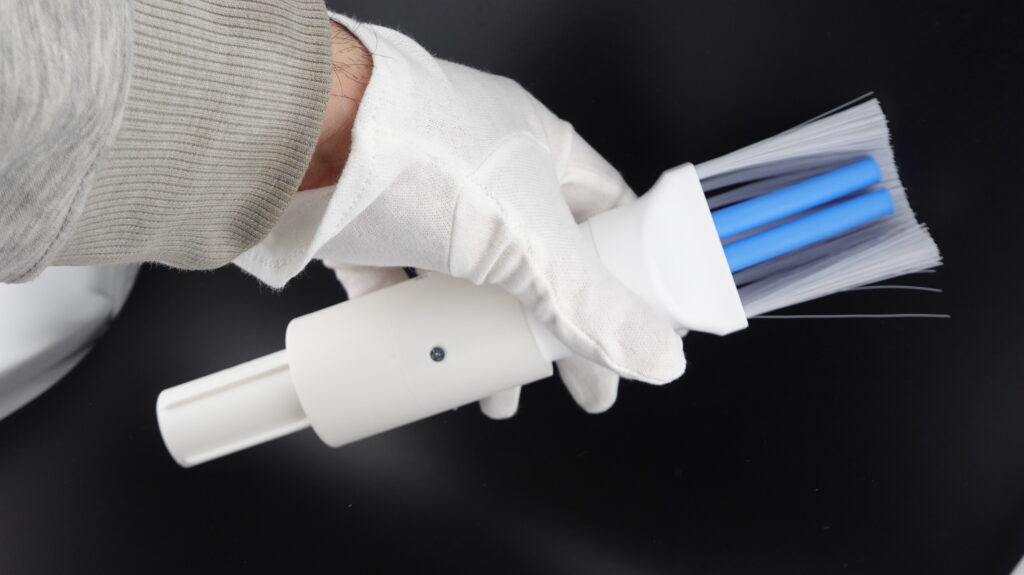100均で買ってきた、掃除機用スミ・隙間掃き出しノズルを合体させて、ダイソンのコネクタと同じギミックに仕上げました。