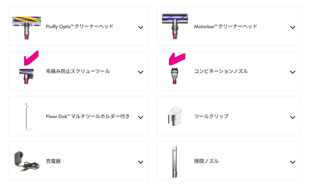 この掃除機実は、公式サイトの「Dyson Micro Plus (SV33 FF PL)」と比較すると、セット内容が違う。