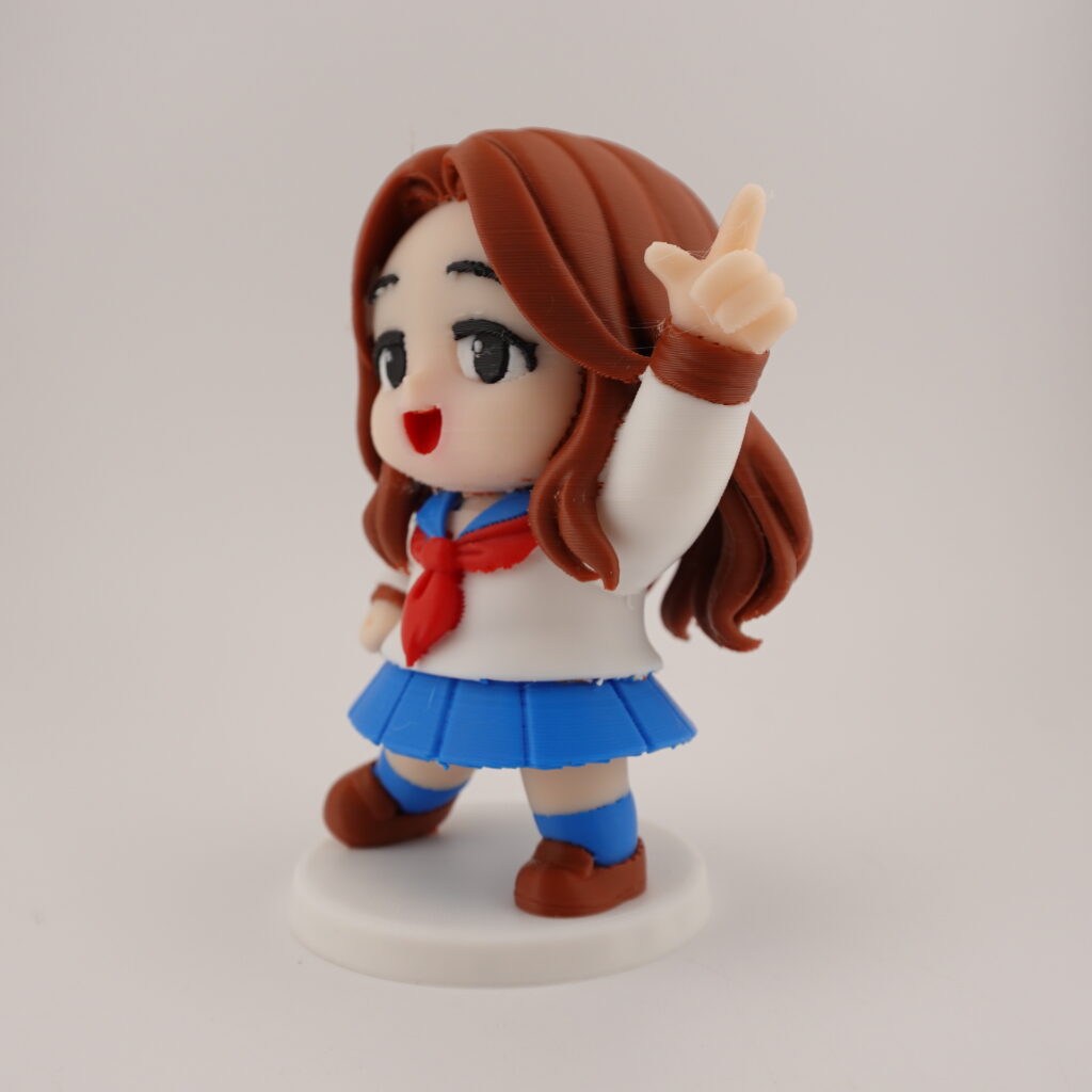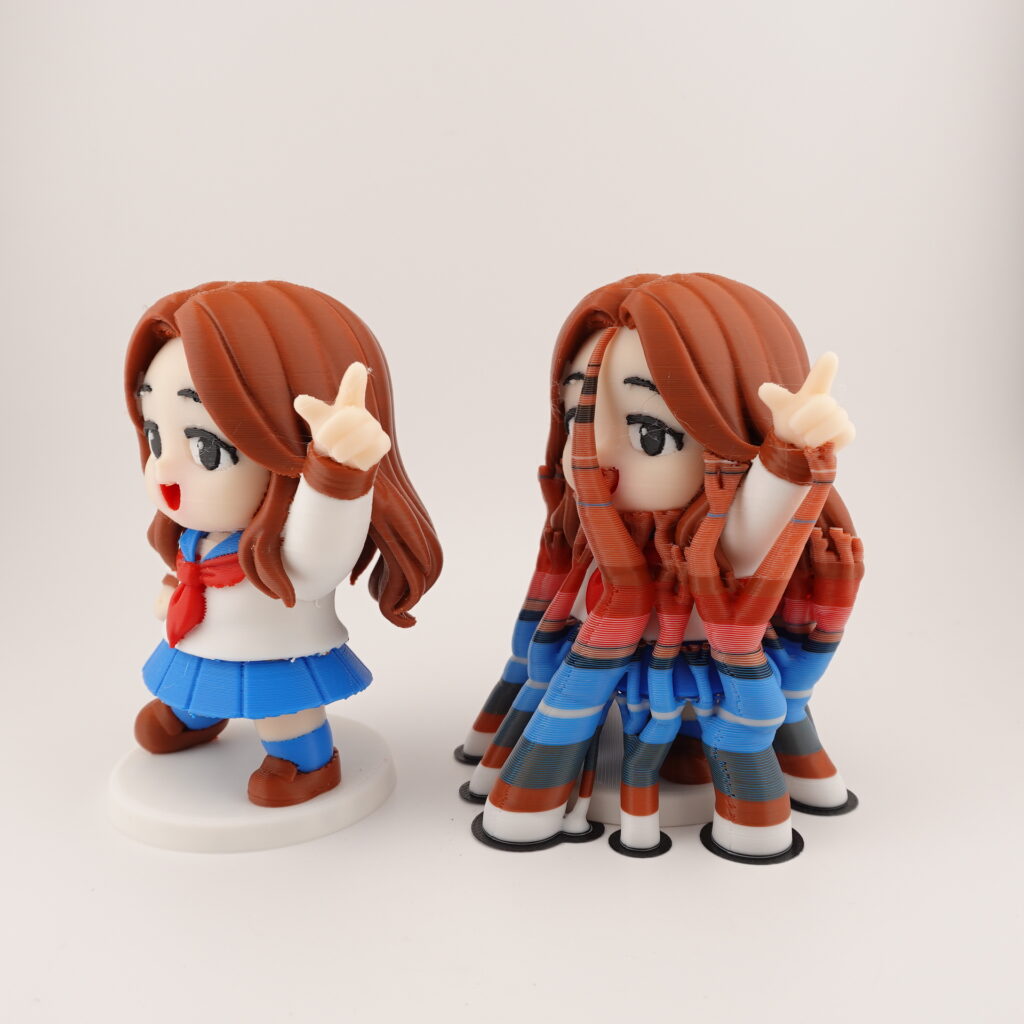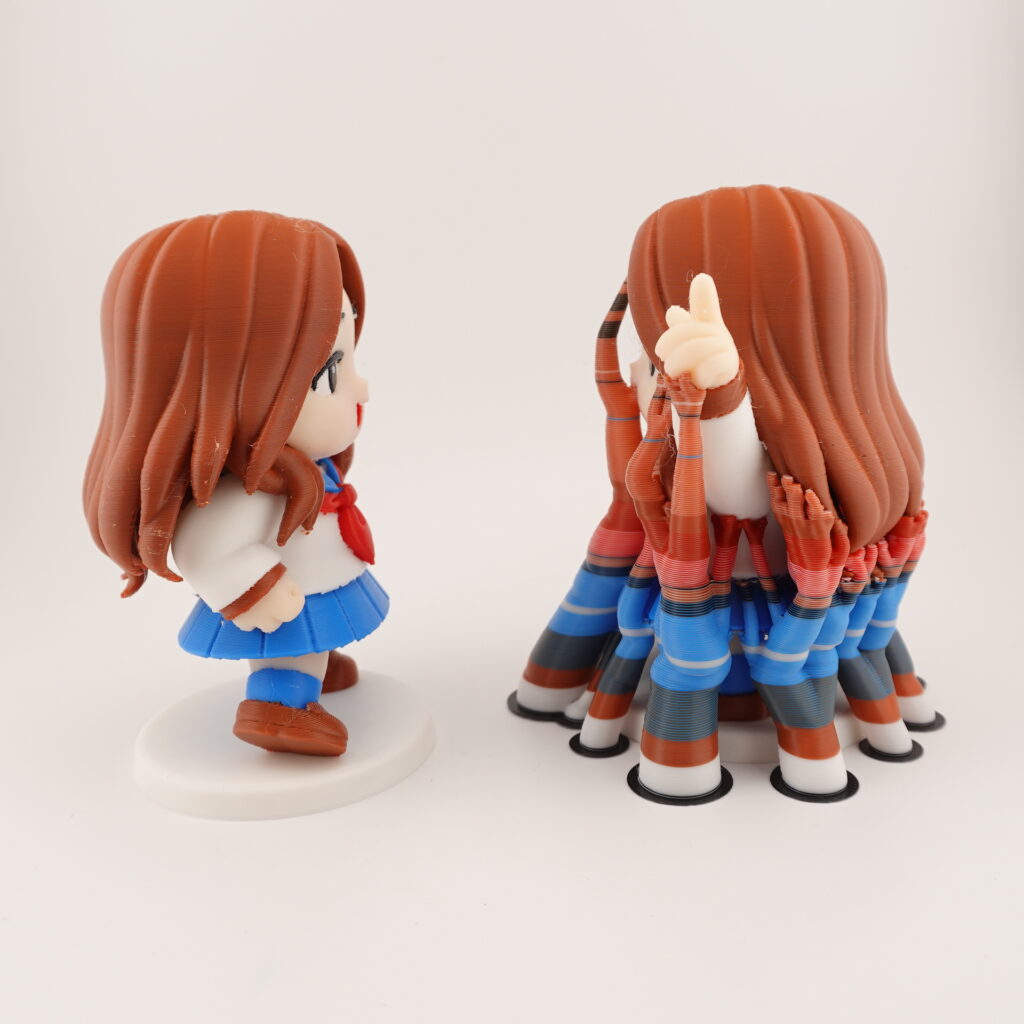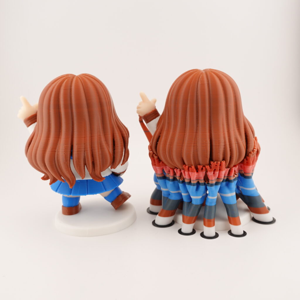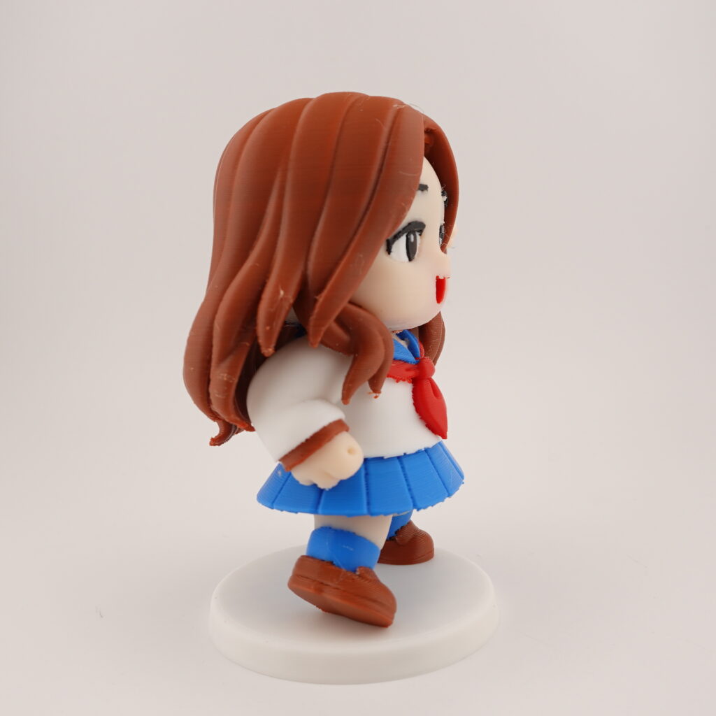 髪のブラウン、肌のベージュ、セーラー服の白と紺、そしてスカーフの鮮やかな赤。これらすべて、出力の段階でそれぞれの色の樹脂(PLA)を切り替えながら積層しています。