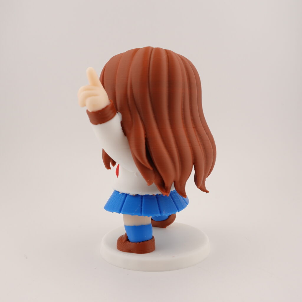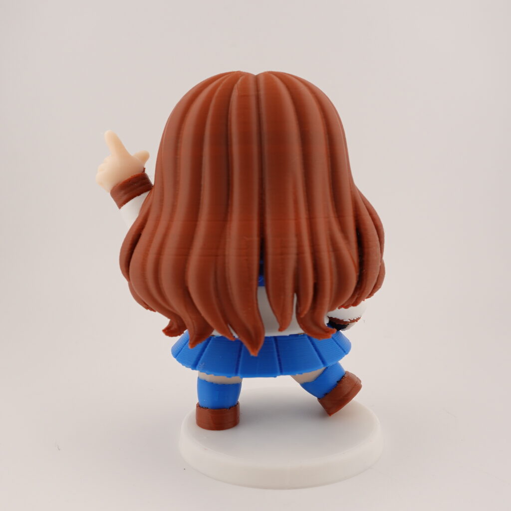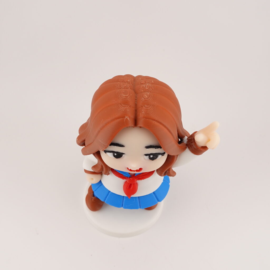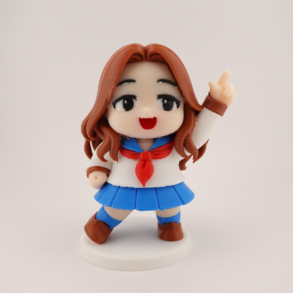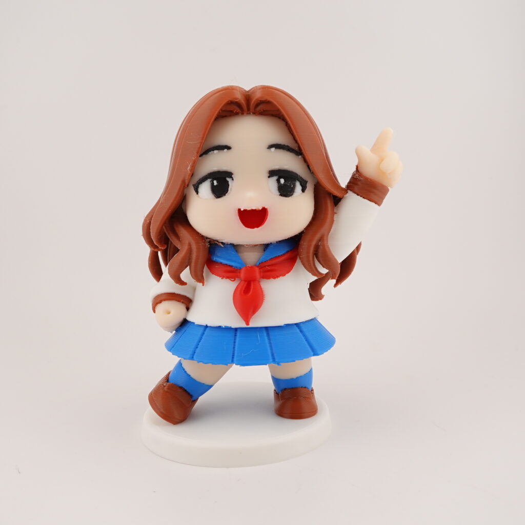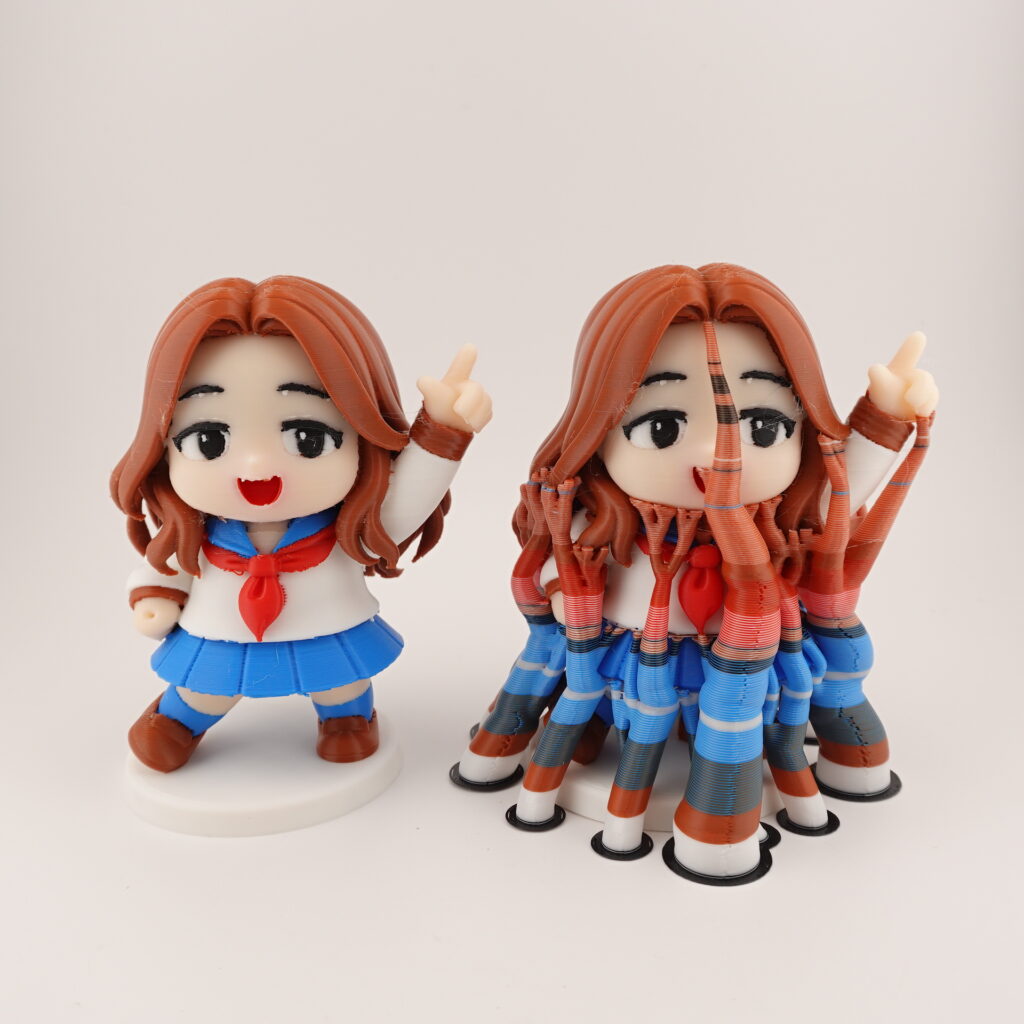 髪のブラウン、肌のベージュ、セーラー服の白と紺、そしてスカーフの鮮やかな赤。これらすべて、出力の段階でそれぞれの色の樹脂(PLA)を切り替えながら積層しています。