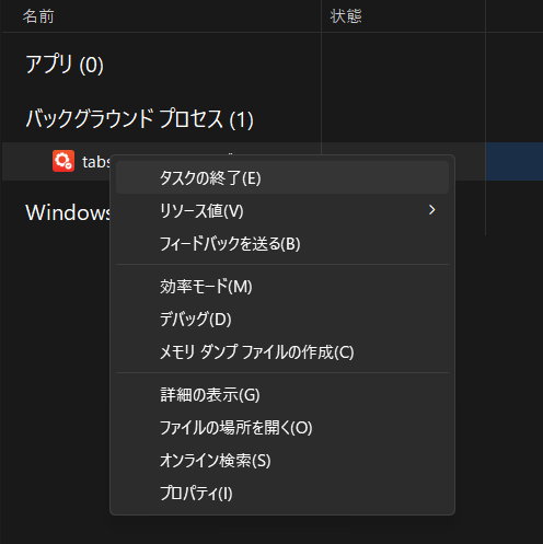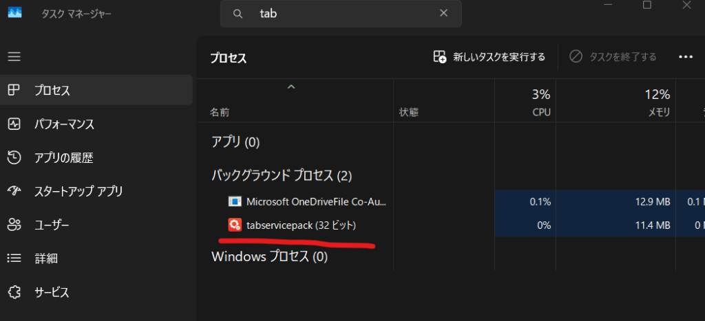 - 「プロセス」タブの検索窓に「Tab」と入力します。