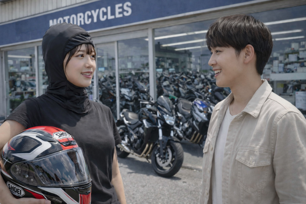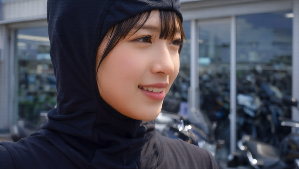 動画の後半では、ライダーの女性がヘルメットを脱いだ後のシーンがあります。
