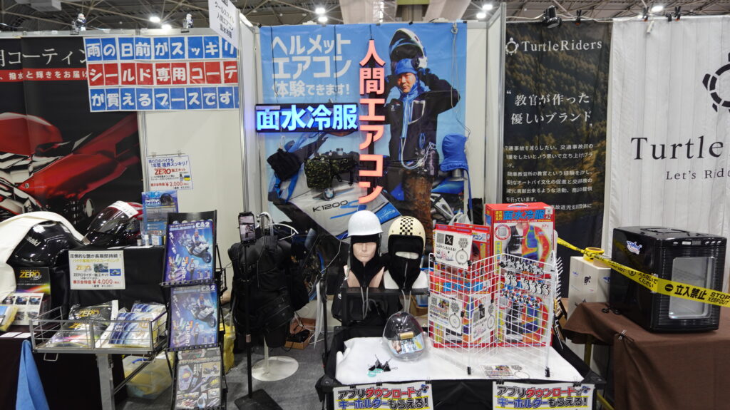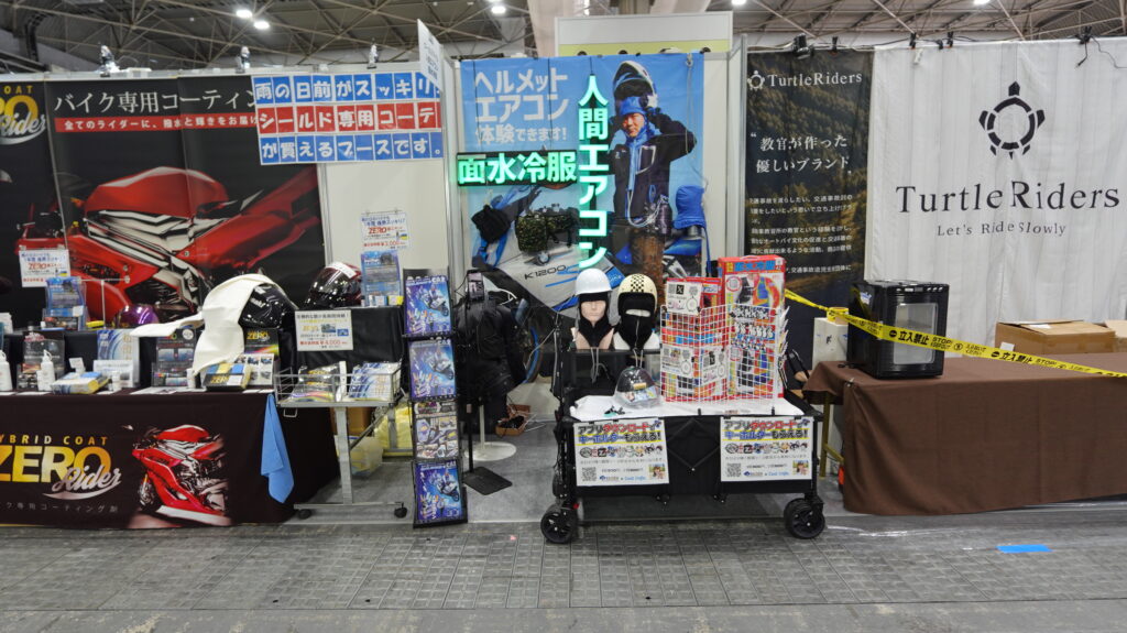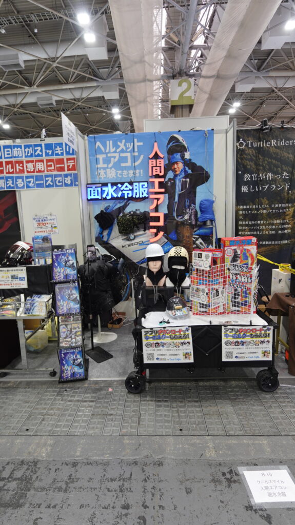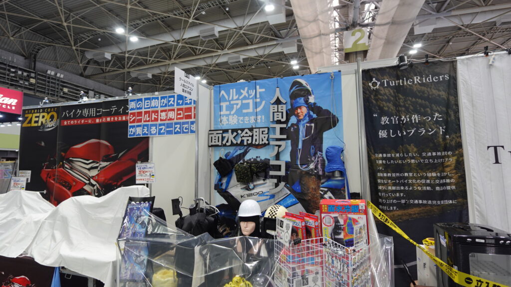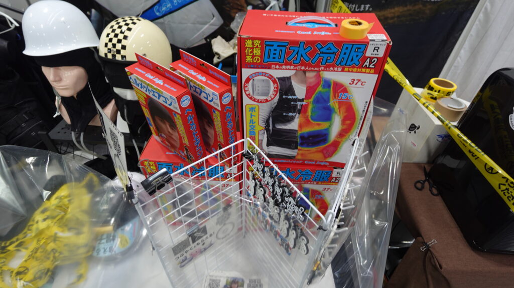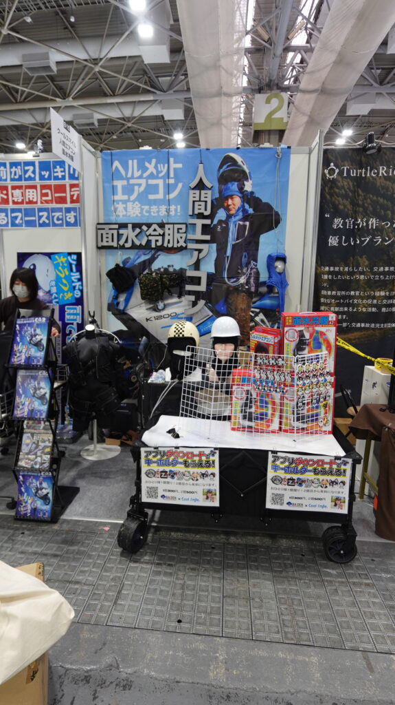 今年のブースは通路が非常に広く、皆様にゆったりと製品をご覧いただける配置になっています。夏場のツーリングを劇的に快適にする「水冷服」の最新モデルを展示しております。