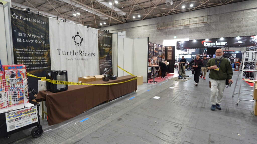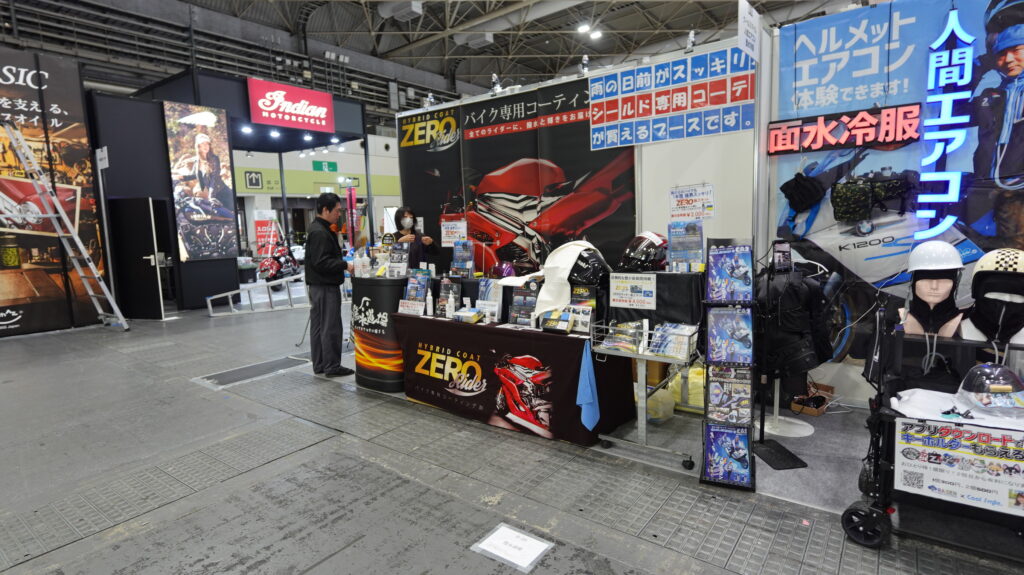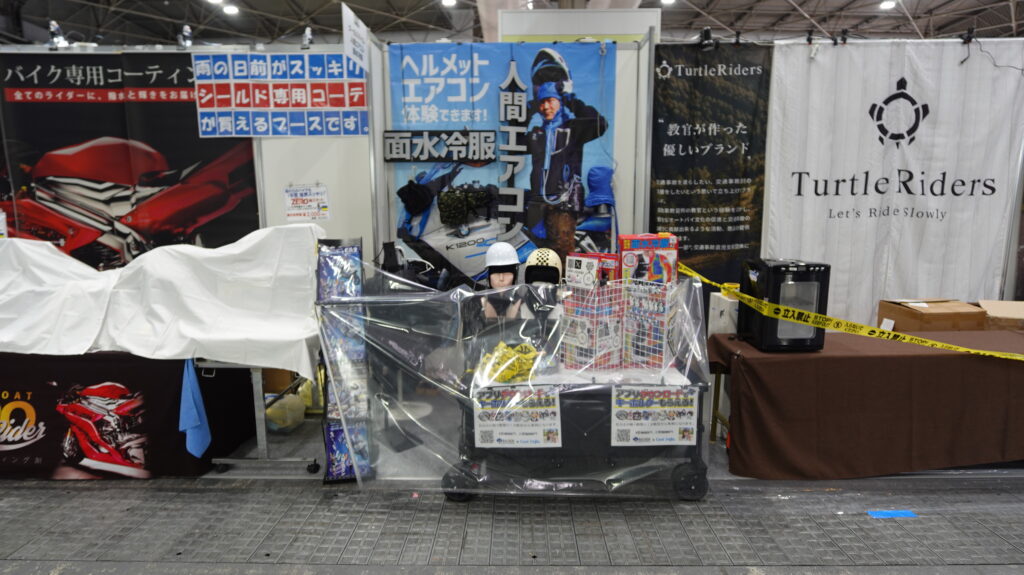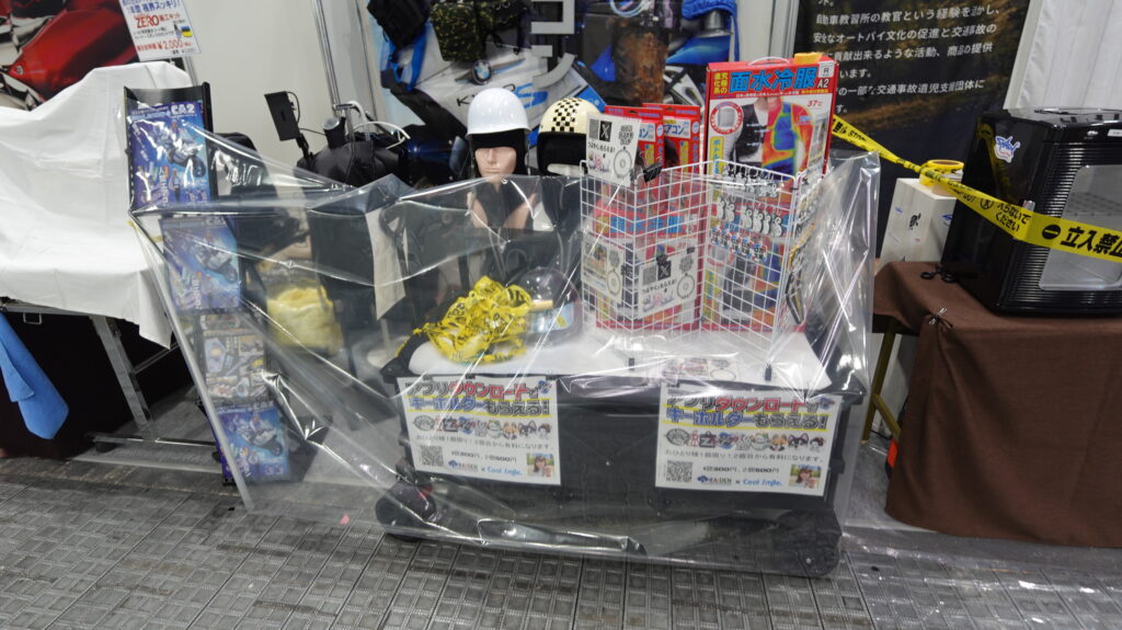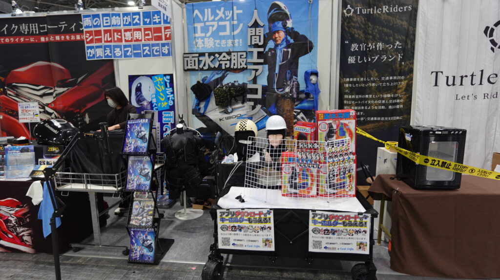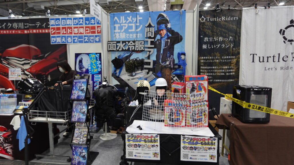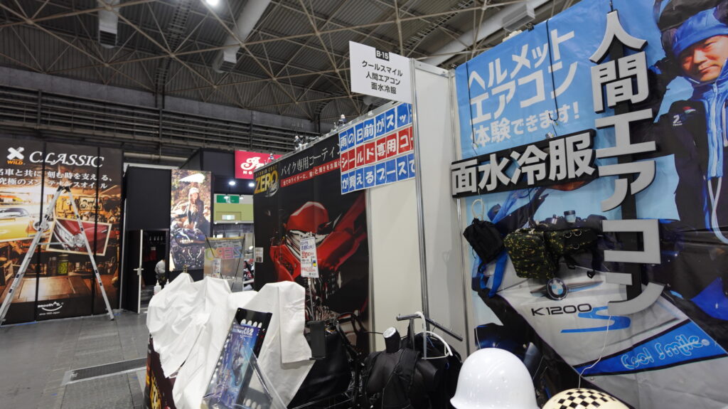 今年のブースは通路が非常に広く、皆様にゆったりと製品をご覧いただける配置になっています。夏場のツーリングを劇的に快適にする「水冷服」の最新モデルを展示しております。